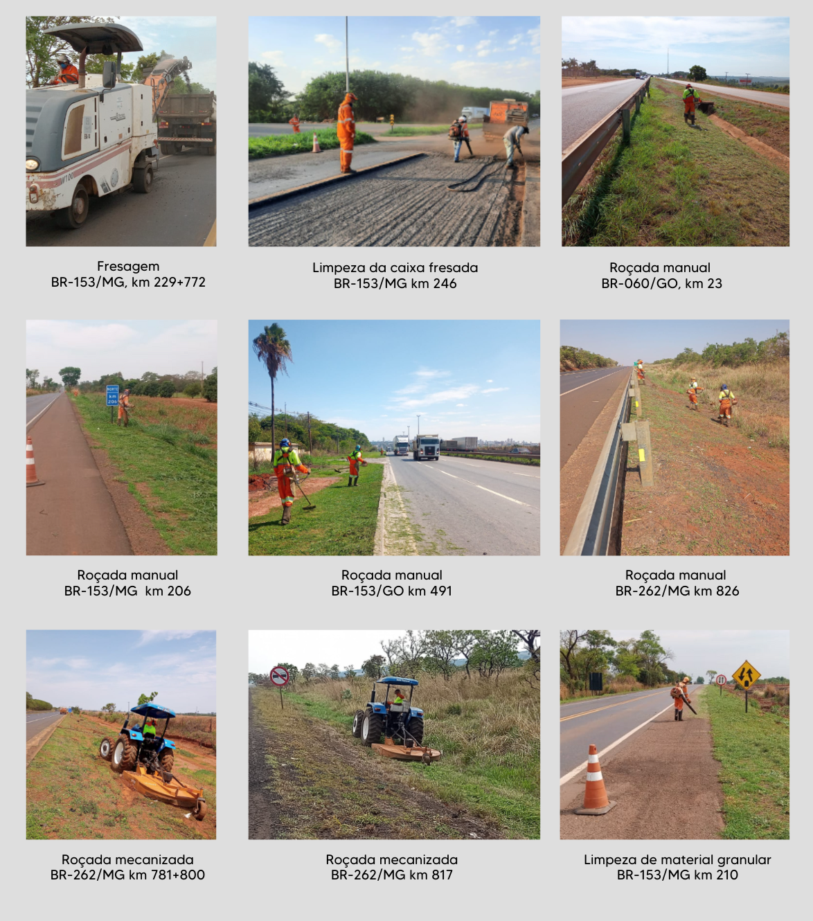 A Triunfo Concebra realiza diversos serviços de conservação ao longo do trecho de concessão, como: manutenção no pavimento e na sinalização horizontal, roçada, limpeza de placas, limpeza de meio-fio, troca de defensa metálica, dentre outros diversos trabalhos.